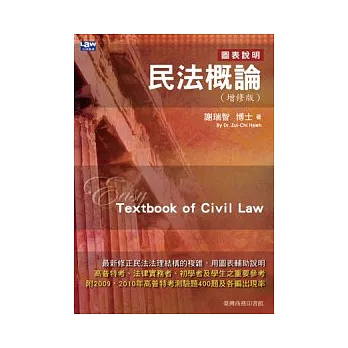 「民法」與我們日常生活最為密切,舉凡生活中所見的各種問題-買賣、贈與、租賃、借貸、出版、委任、合夥、保證、所有權、農育權、不動產役權、婚姻、監護、扶養、親屬、繼承……無一不涉及民法,認識「民法」,明白各種權利義務關係,可說是保障個人、家人及生活的第一步。本書依最新修正之民法內容如地上權、農育權、不動產役權及親屬、繼承等撰寫,並有鑑於民法法理結構的複雜,以生活實例說明、精製圖表析論比較,易懂易學;是人人必備的民法常識手冊。全書並針對國家考試,詳附各編內容試題出現率及「2009、2010年高普特考測驗題」,亦是法學精進及準備考試的必備用書。
